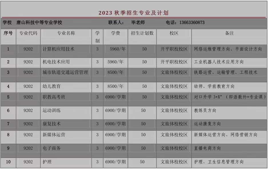 唐山科技中專,開設(shè)有計算機(jī)應(yīng)用,平面設(shè)計、機(jī)電技術(shù)應(yīng)用、衛(wèi)生信息管理、舞蹈表演、城市軌道交通運營服務(wù)、幼兒保育、航空服務(wù)、播音主持、工業(yè)機(jī)器人、無人機(jī)操作、運動訓(xùn)練(護(hù)理、康復(fù)技術(shù)方向)、會計事務(wù)等多個專業(yè)。