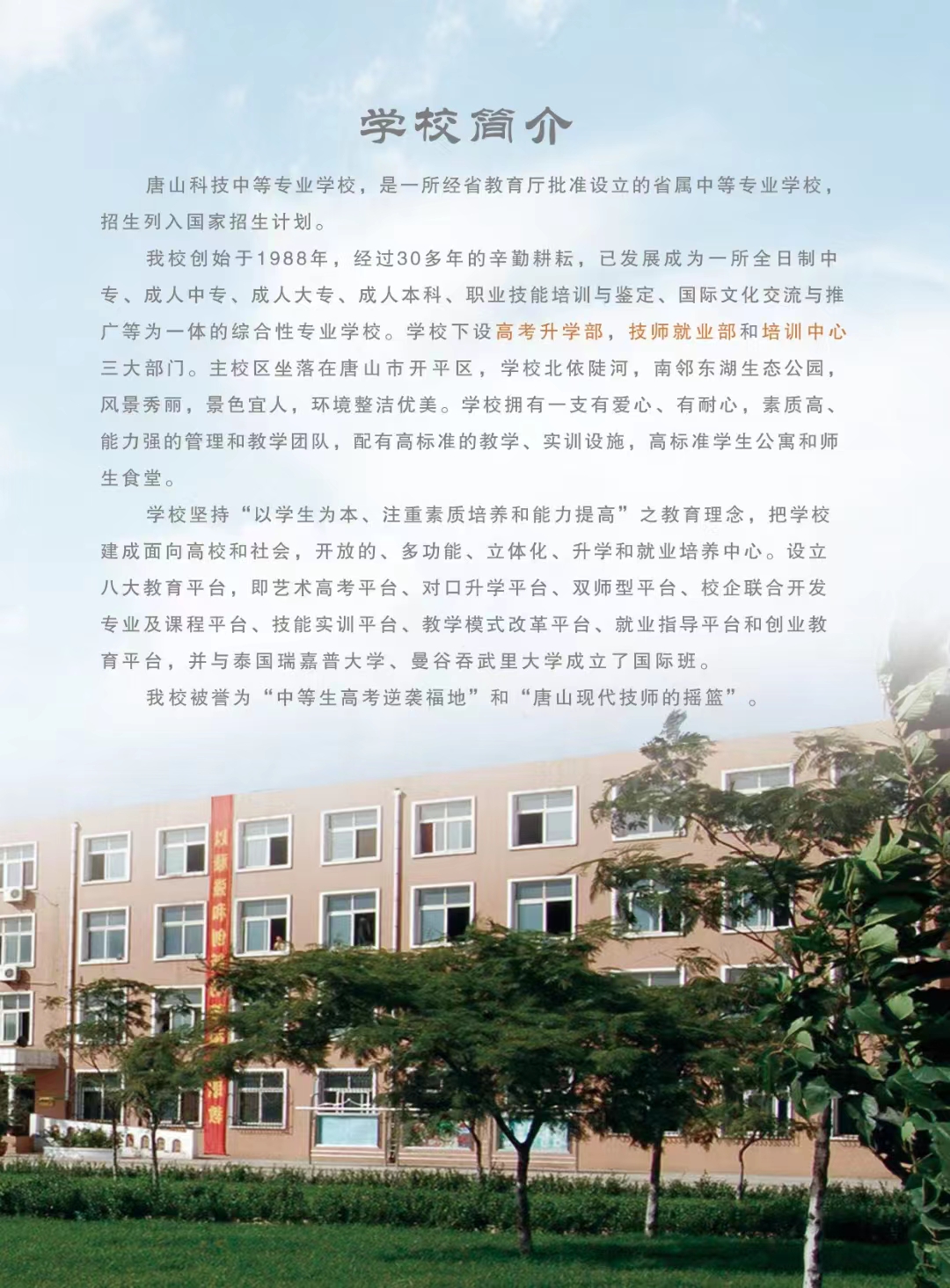 唐山科技中等專業(yè)學(xué)校成立于 1988 年,經(jīng)省教育廳批準(zhǔn)建立的普通中等專業(yè)學(xué)校,招生列入國家計(jì)劃,是一所培養(yǎng)多種技能人才的大規(guī)模、綜合性中等專業(yè)學(xué)校。校園環(huán)境優(yōu)美,各種教學(xué)實(shí)習(xí)、實(shí)驗(yàn)場地齊全。學(xué)校一直堅(jiān)持“以人為本”的教學(xué)理念,聘請(qǐng)多名具有高級(jí)職稱的雙師型教師任教,結(jié)合市場的需求,在專業(yè)知識(shí),職業(yè)體驗(yàn),生產(chǎn)訓(xùn)練各方面努力培養(yǎng)技能與素質(zhì)教育協(xié)調(diào)發(fā)展的新型技術(shù)人才。